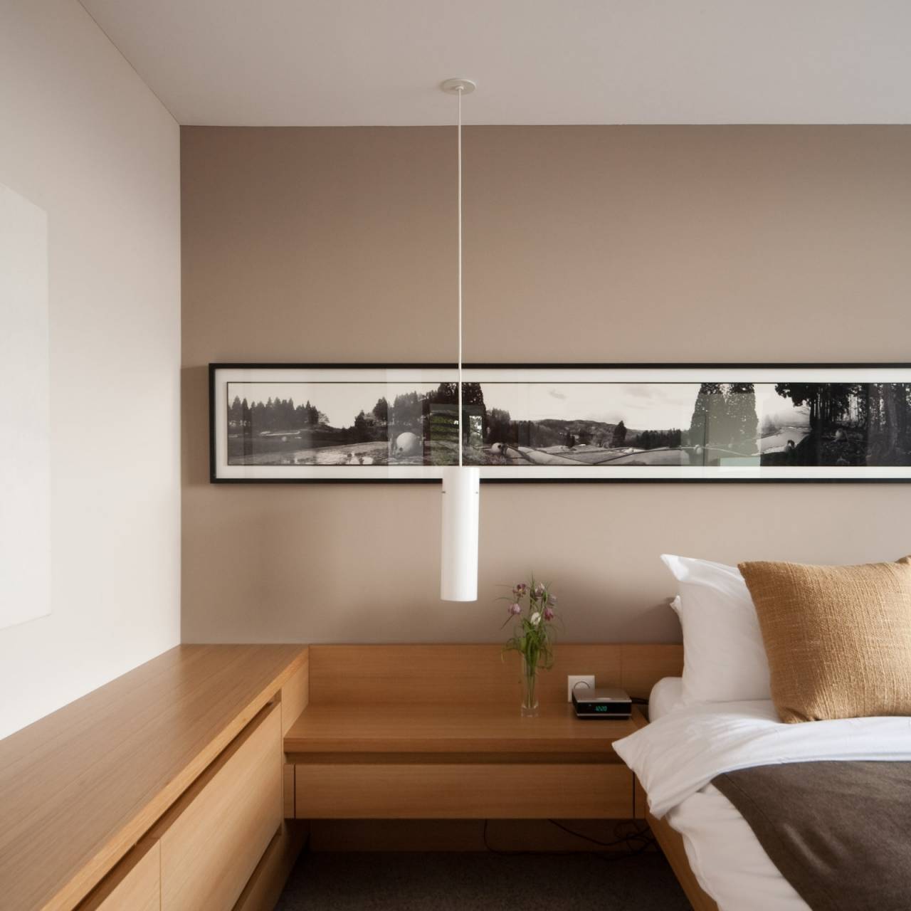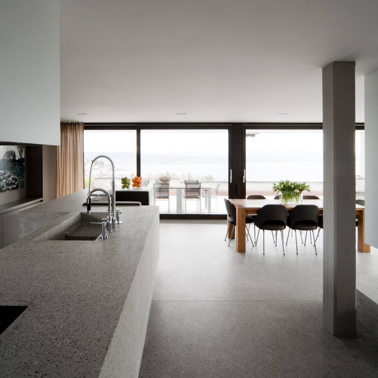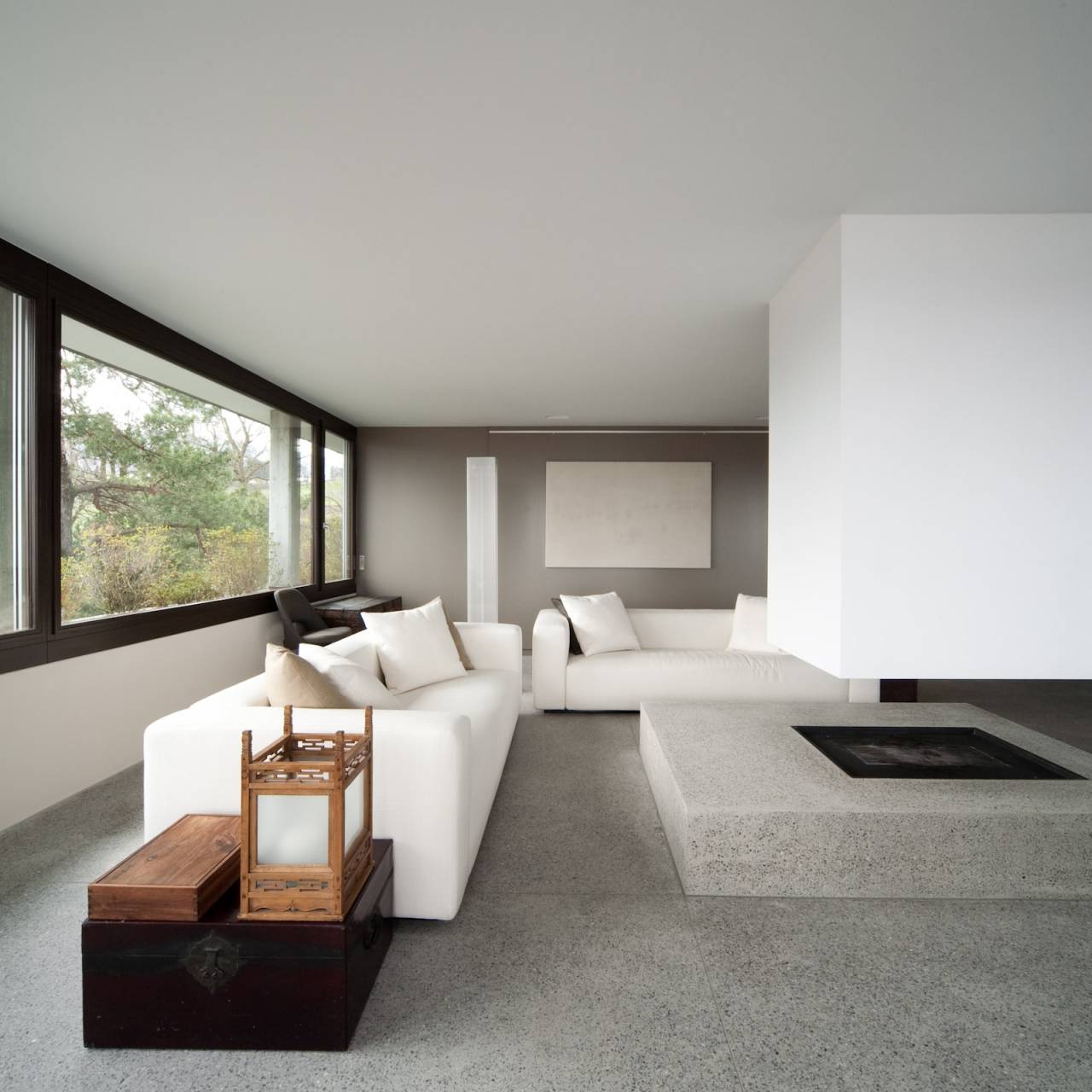 Das 1973 erstellte Einfamilienhaus genießt mit seiner Hanglage den ungestörten Ausblick auf den Zürichsee. Zusammen mit den großzügigen Aussenterrassen und Grünflächen, bietet der Bau auf drei Geschossen einen Empfang mit Salon und Küche, im Mittelbereich Schlafräume mit einem Alltagsraum und zuunterst Schwimmbad und den Gästebereich mit Waschküche und Arbeitsbereich. Das Haus wird durch ein überdimensionales Schmetterlingsdach auf Metallstützen geprägt. Durch den Umbau der Innenräume sollte eine Modernisierung des Baus erreicht werden und dem Lebensstandard der neuen Bauherrschaft als passionierte Kunstsammler und Gastgeber Rechnung getragen werden. Die bestehende Formensprache wurde beibehalten. Die typische 70–er Jahre Architektur mit seiner pavillonartigen Dachstruktur wurde durch den partiellen Rückbau wiederhergestellt. Alt und neu sind kaum mehr voneinander zu unterscheiden. Das Hauptgeschoss besteht aus einer Topographie von Boden– und Deckenflächen. Hierfür wurde ein geschliffener Hartbeton als monolithischer Guss für Boden, Feuerstelle, Sitznische und Küchenelement verwendet. Als Pendant wirkt die durchgehend mineralisch gestrichene Decke mit integrierten Leuchten, Küchenabluft und Kamin.