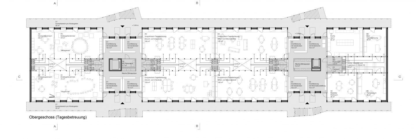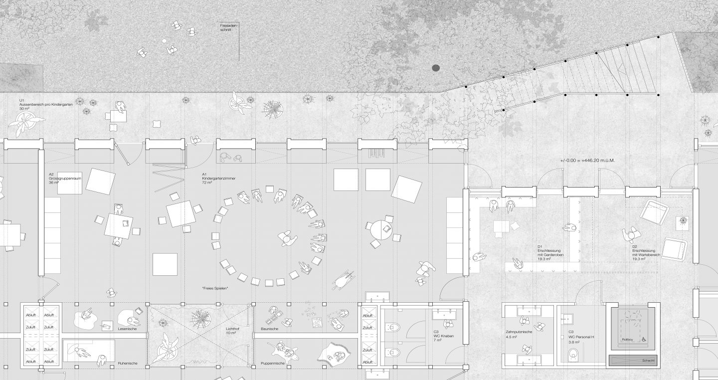 Der Neubau ist ein einladender Holzbau, der die 7 Kindergärten und 4 Horte in einem kompakten Volumen vereint. Die Erschliessung erfolgt dezentral über vorgelagerte Balkone, die von der japanischen Engawa (Zwischenzone) inspiriert sind. Dadurch wird eine lokale Identität geschaffen und das Gebäude hat grossen Bezug zu seiner Umgebung. Die Treppen reagieren auf die Zugänge des Areals und schaffen eine optimale Vernetzung. In der Gebäudemitte liegt eine funktionale Kernzone mit Lichthöfen, die neben optimaler Raumbelichtung und -belüftung auch Blickbeziehungen und Begegnungszonen ermöglicht. Durch die dezentrale Erschliessung wird auf interne Korridore und Treppenhäuser komplett verzichtet, was einerseits sehr kosteneffizient ist, andererseits aber auch dem Gebäude seinen offenen, vernetzenden Charakter verleiht. Der Neubau vereint acht Häuser in sich.
