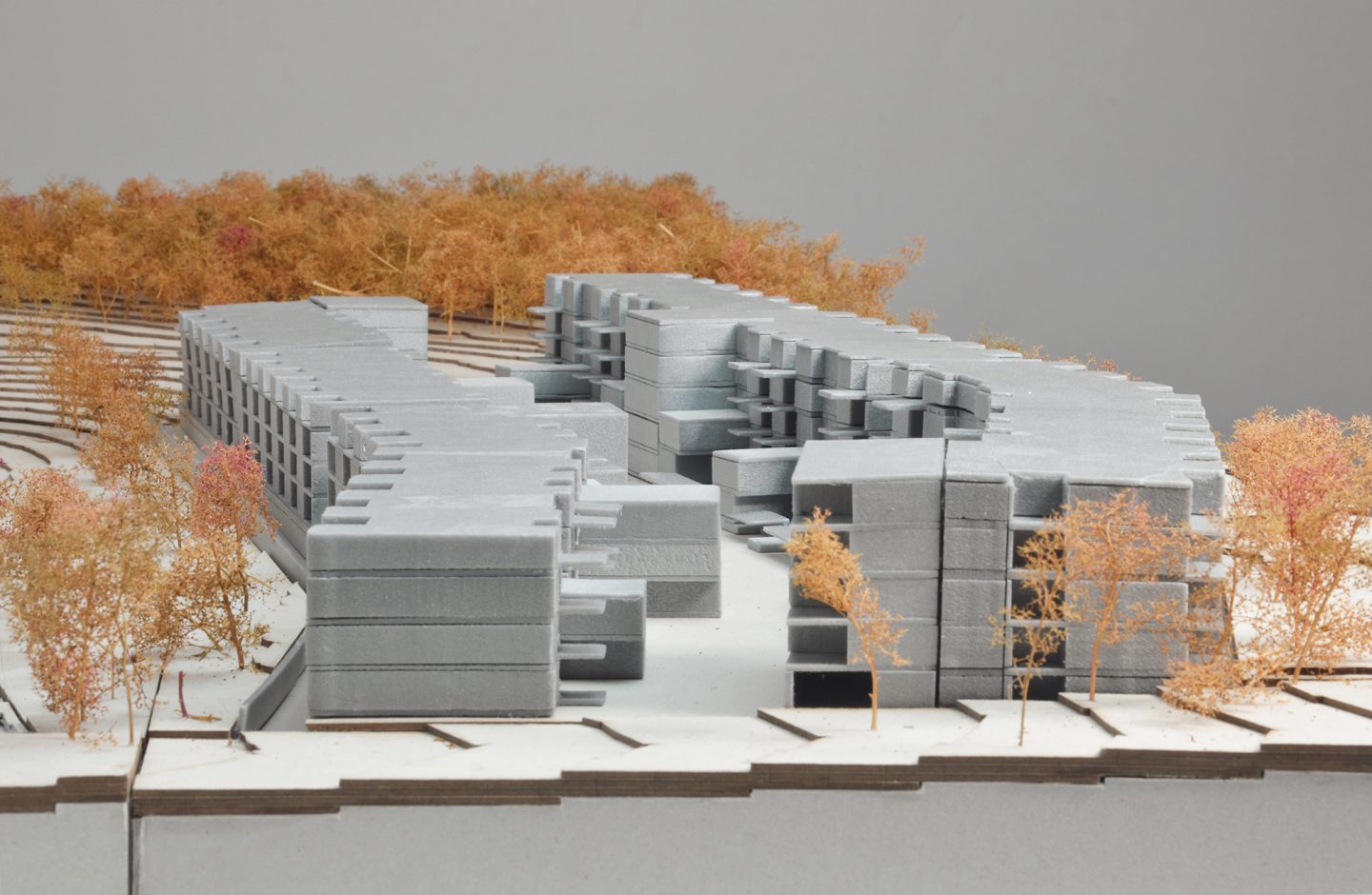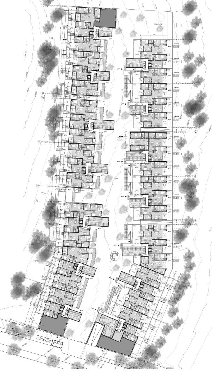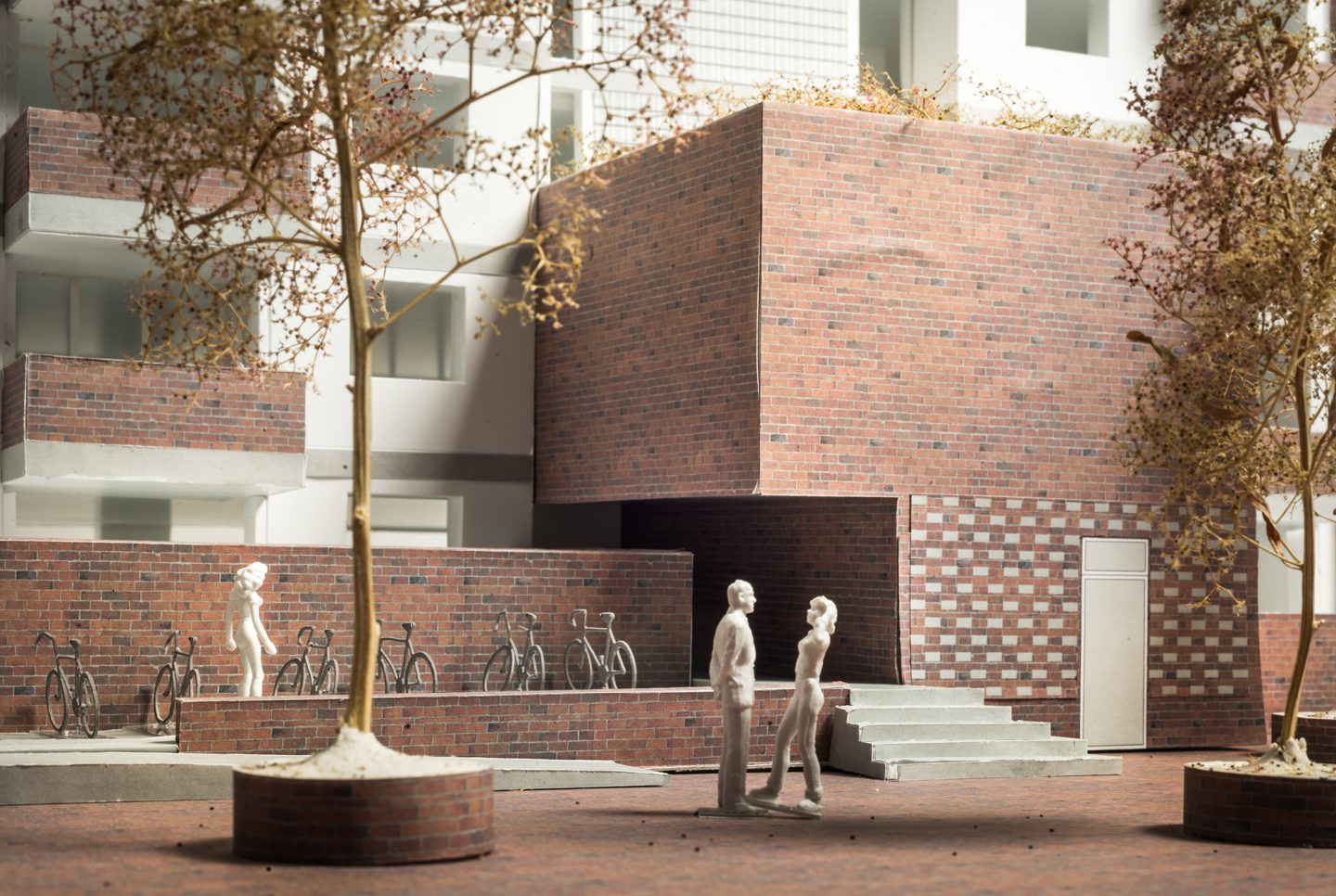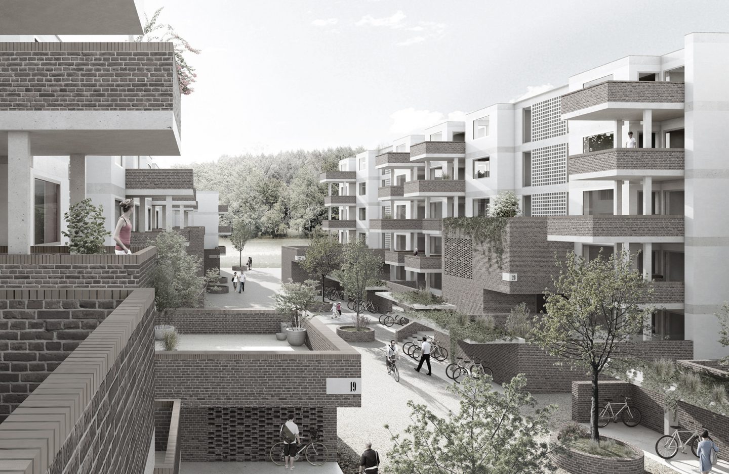 Der Siedlungsraum des Baufeldes B ist mit seinem vielfach gegliederten Quartierhof eine veritable Nachbarschaftsmaschine. Alle architektonischen Elemente, die sich ausserhalb der Gebäudekörper befinden und keine Wärmedämmung enthalten, sind aus vorfabrizierten Backsteinelementen hergestellt. Dies erzeugt eine starke Identität und signalisiert eine hohe Wertschätzung des kollektiven Lebensraumes. In den langgestreckten, platzartigen Höfen kann sich das soziale Leben des Quartiers entfalten. Die vorspringenden Hofbauten enthalten Waschküche, Kinderwagenräume und Dachterrasse für das jeweilige Wohnhaus. Die Backsteinvolumen strukturieren den Siedlungsraum und schaffen klare Adressen. Die Wohnungen werden direkt aus der Logik des Masterplans abgeleitet: Jeder wohnt am Grünen. Die Ost-West-Orientierung ermöglicht Grundrisse mit durchgehenden Wohnbereichen, um sowohl von der weiten Landschaft, wie auch von der Qualität des Quartierhofes zu profitieren.