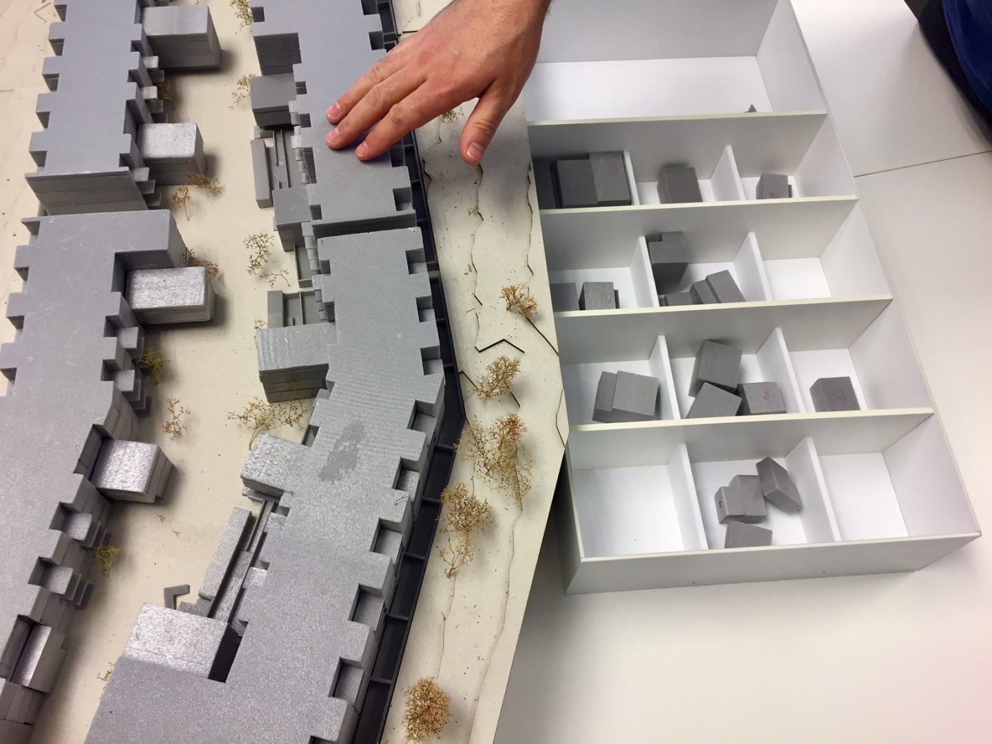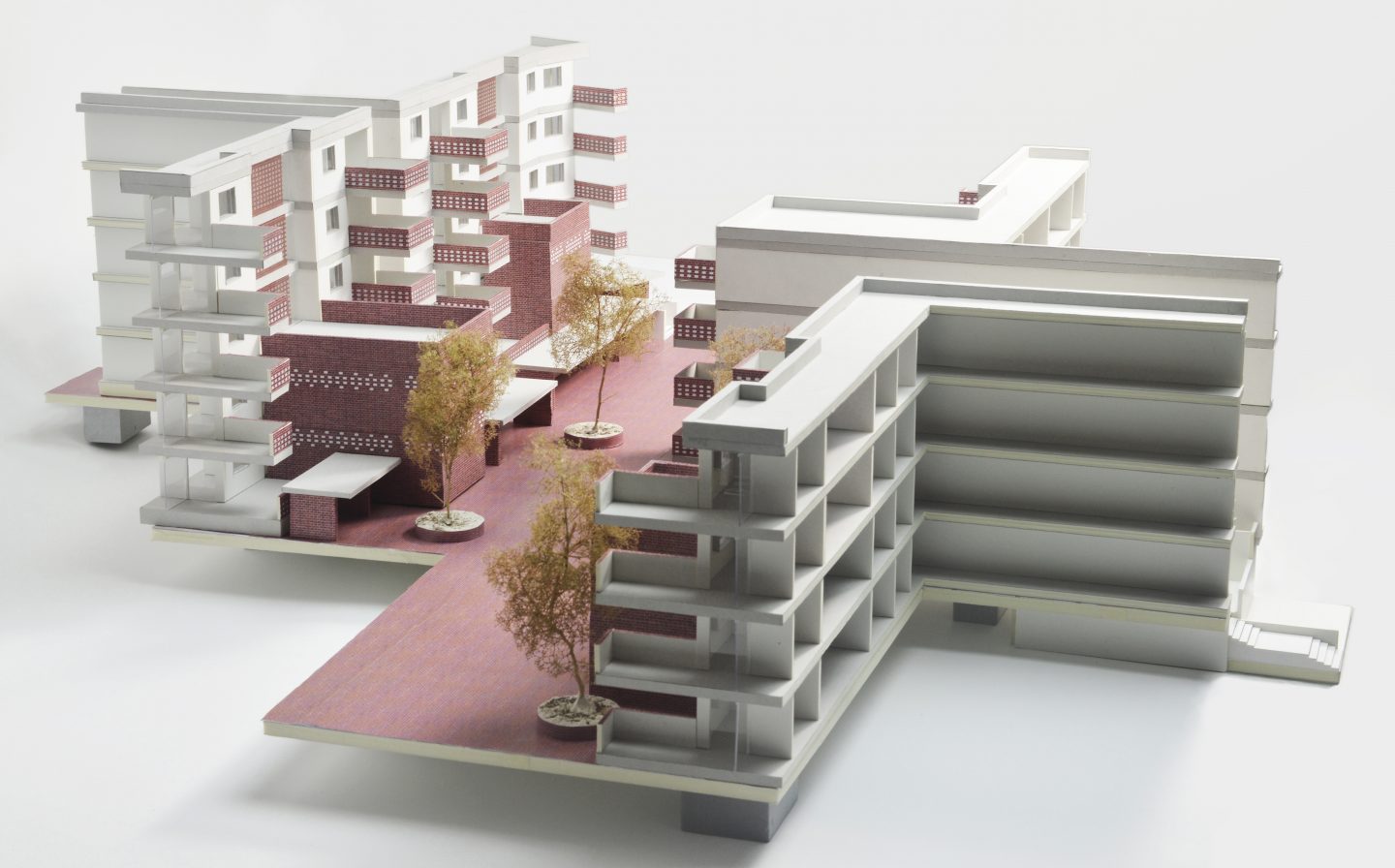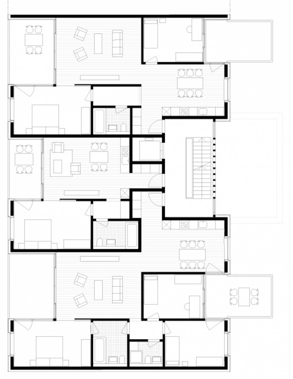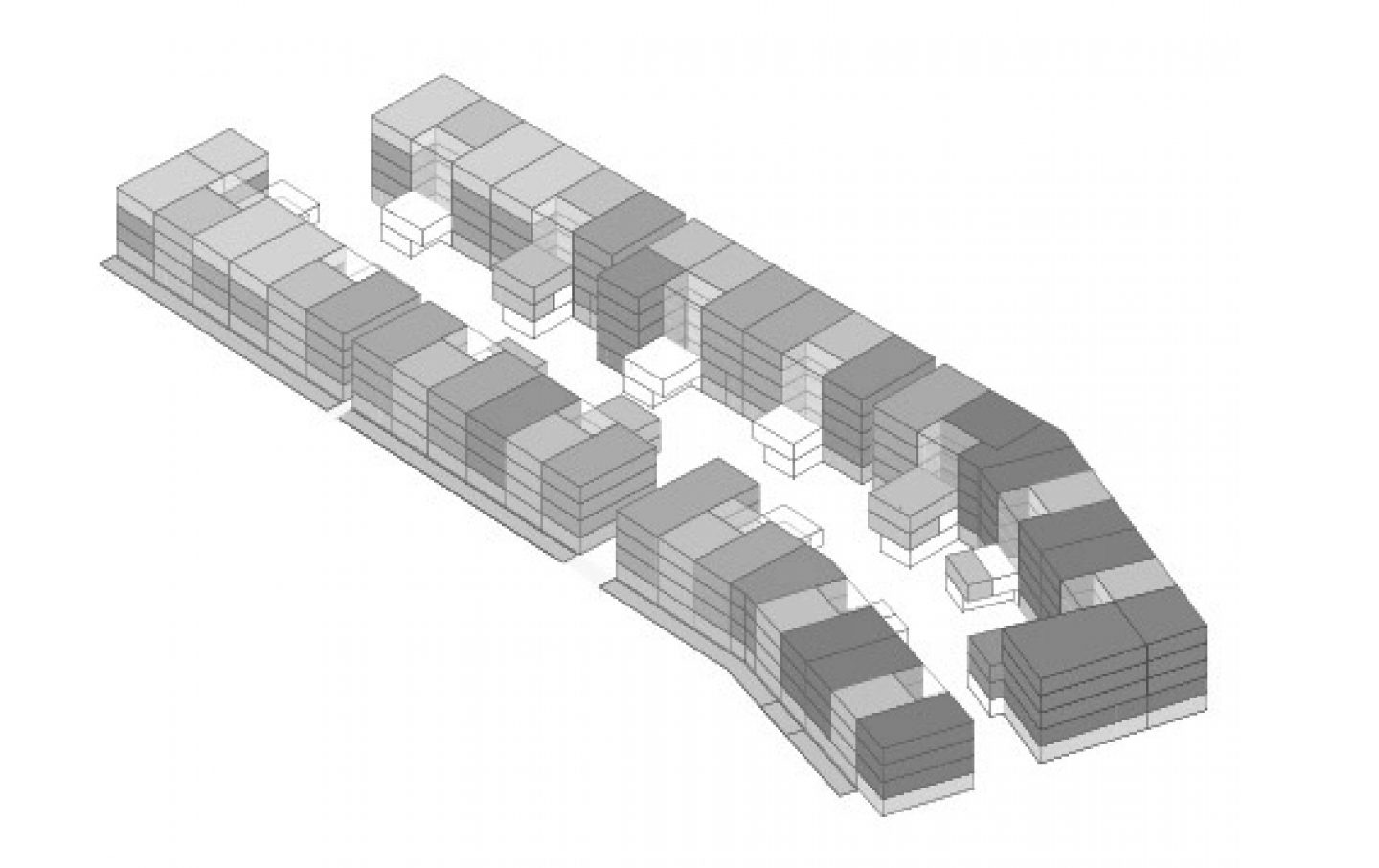 Der Siedlungsraum des Baufeldes B ist mit seinem vielfach gegliederten Quartierhof eine veritable Nachbarschaftsmaschine. Alle architektonischen Elemente, die sich ausserhalb der Gebäudekörper befinden und keine Wärmedämmung enthalten, sind aus vorfabrizierten Backsteinelementen hergestellt. Dies erzeugt eine starke Identität und signalisiert eine hohe Wertschätzung des kollektiven Lebensraumes. In den langgestreckten, platzartigen Höfen kann sich das soziale Leben des Quartiers entfalten. Die vorspringenden Hofbauten enthalten Waschküche, Kinderwagenräume und Dachterrasse für das jeweilige Wohnhaus. Die Backsteinvolumen strukturieren den Siedlungsraum und schaffen klare Adressen. Die Wohnungen werden direkt aus der Logik des Masterplans abgeleitet: Jeder wohnt am Grünen. Die Ost-West-Orientierung ermöglicht Grundrisse mit durchgehenden Wohnbereichen, um sowohl von der weiten Landschaft, wie auch von der Qualität des Quartierhofes zu profitieren.