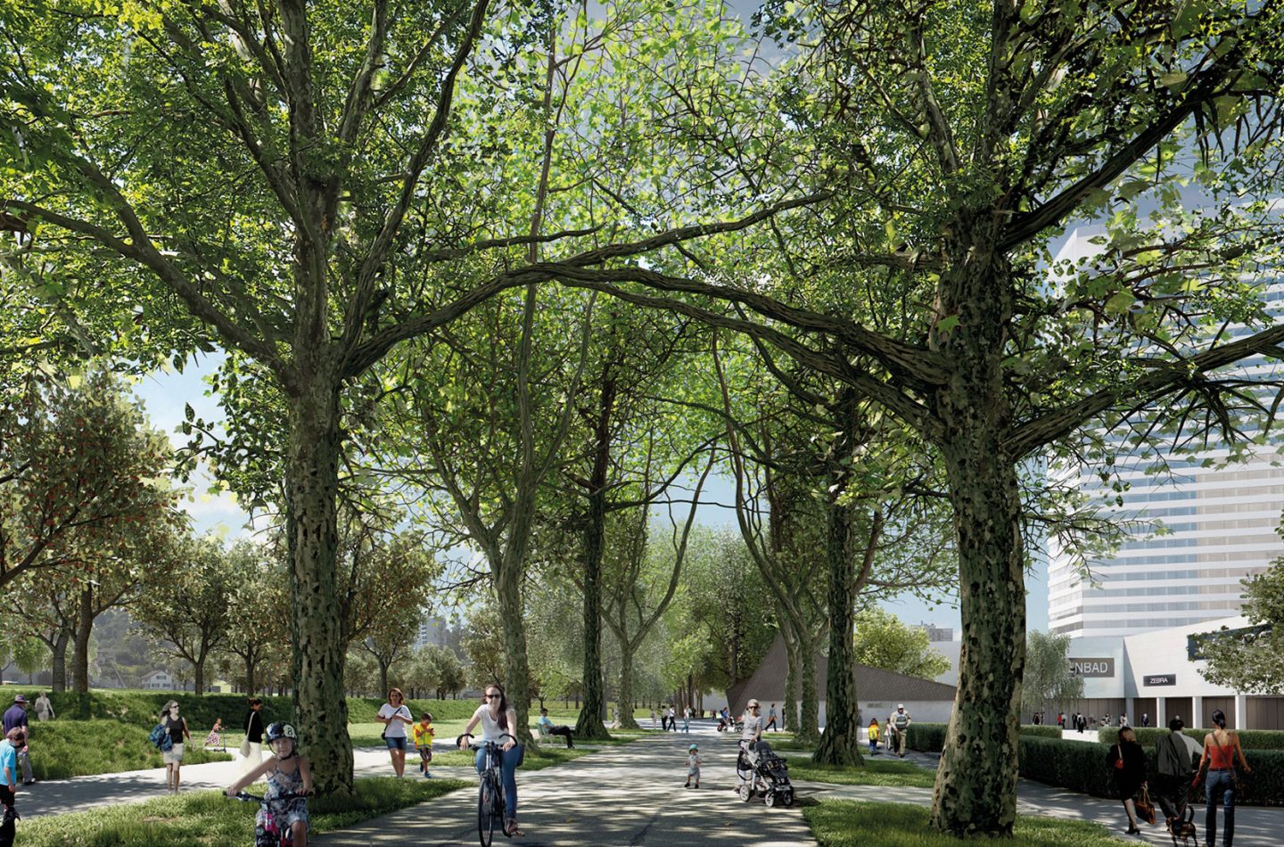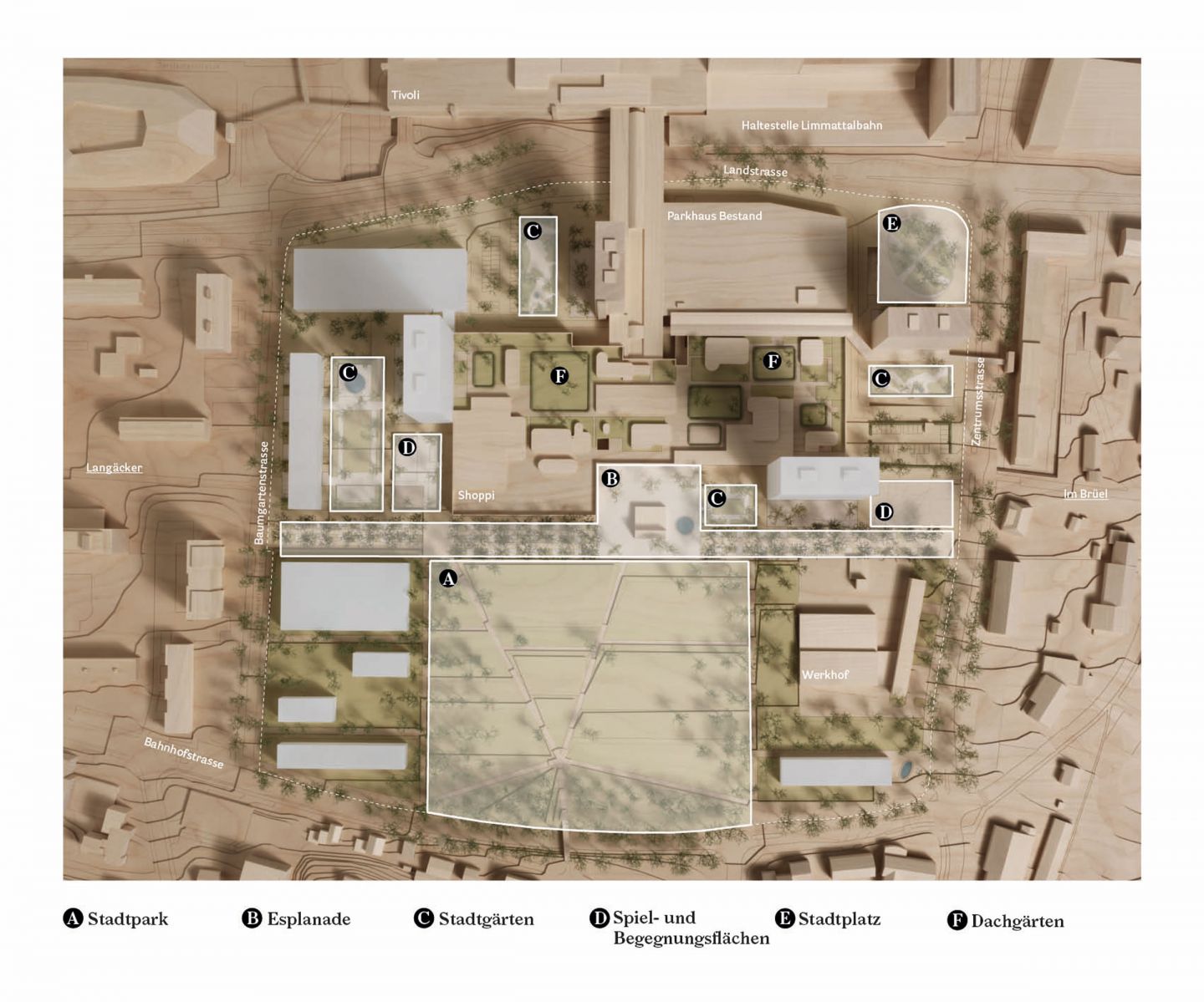 Die Zentrumsentwicklung wird die verschiedenen Gebiete zusammenführen und in der Mitte verknüpfen. Der bisher von Parkplätzen und Strassen dominierte Raum um das ShoppiTivoli erhält einen völlig neuen Charakter: Für die Bevölkerung entstehen ein grosszügiger Stadtpark, eine Esplanade und zum Verweilen einladende Stadtgärten, Sport- und Begegnungsplätze sowie ein Stadtplatz.