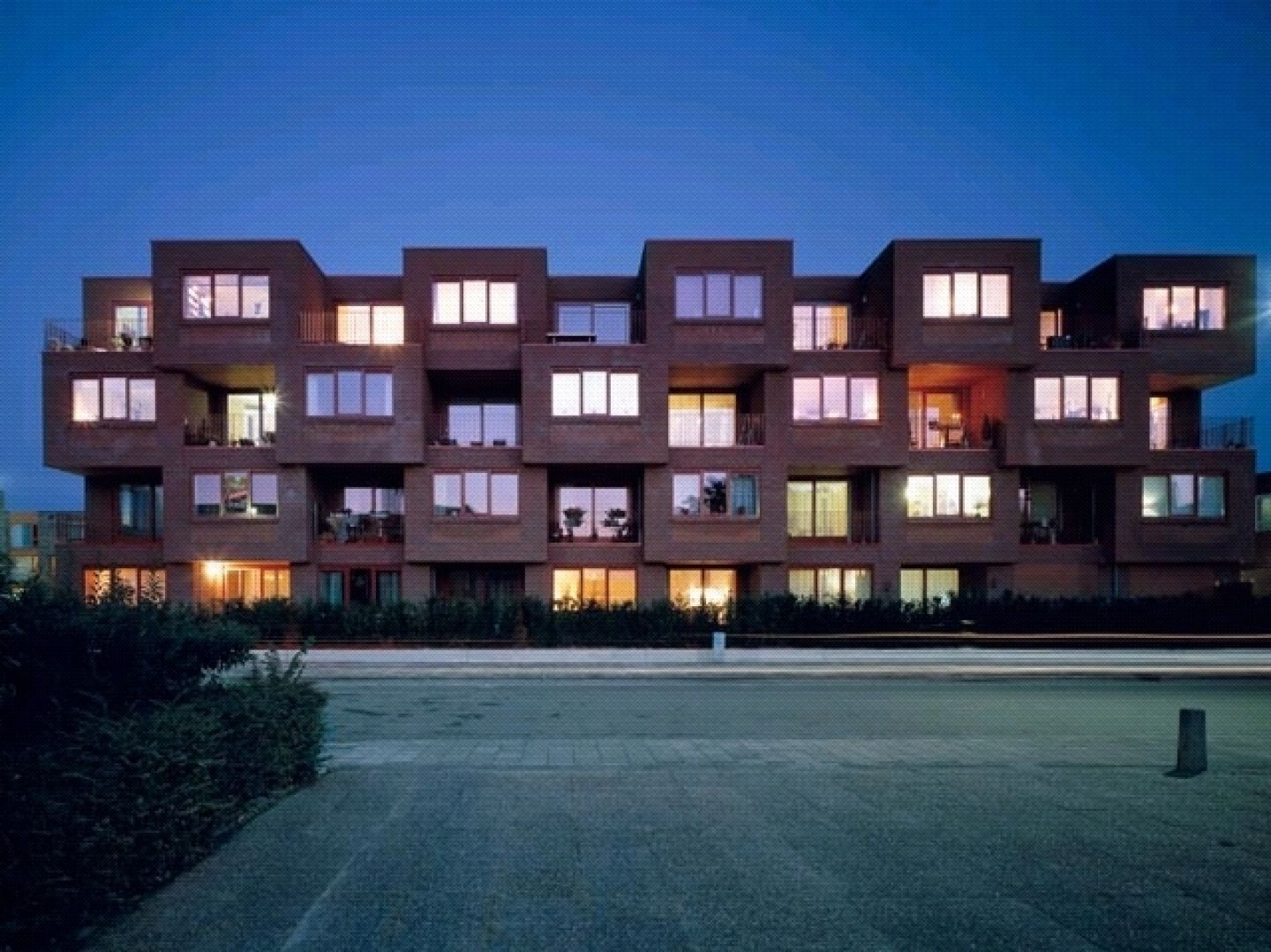 Die Baukosten in den urbanen Gebieten der Niederlande sind einem enormen, stets wachsenden Preisdruck ausgesetzt. Konsequenterweise wird dadurch auch die Nachfrage nach preisgünstigen Eigentumswohnungen stets grösser, was nur durch eine grösstmögliche Standardisierung der Grundrisse und Bauteile zu erreichen ist. Durch die technische Ausreizung der Betonvorfabrikationsmethoden, konnten wir eine reliefartige Fassade gestalten, in welcher das Vor- und Rückspringen der Erker und Loggien das gestalterische Hauptmotiv bildet. Auf 4 Geschossen verteilen sich 19 Wohnungen, welche in Einteilung und Aufbau nahezu identisch sind. Die Schlafzimmer befinden sich auf der Westseite des Gebäudes. Auf der Ostfassade gestalten vorspringende Erker und Loggien ein dreidimensionales Relief. Durch diesen Eingriff erhält jede Wohnung einen hellen Wohnraum. Die durchsnittliche Wohnungsgrösse beträgt 90 m2. Alle Sanitärzellen sind in der Mitte des Gebäudes konzentriert, sodass die Anzahl an Schächten auf ein Minimum reduziert werden kann.